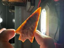 Nice parallel oblique flaking and beautiful maroon colored banding in this point made from Coastal Plains chert from Brier Creek! Serrated sharp, thanks for looking! |