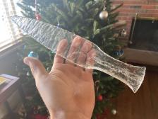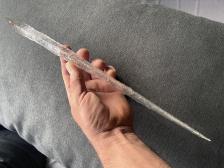Philip Churchill was an amazing knapper and friend. I bought this dagger from him around 2010. It’s made of a man made fused quartz, a section of a lens I believe he said that he purchased, the slabs were quite expensive. I paid $400 for the dagger then and am selling it because I’ve had it stored away and it needs to be displayed and enjoyed. The work is excellent on this material that’s very challenging to pressure because if it’s transparency. The pommel is stitched on both faces with excellent control. He made the piece by percussion knapping the slab and then hand grinding it before the finish pressure and stitching. If you’d like to see a video of it, email me at martyrueter@yahoo.com and I’ll send a link. |