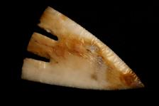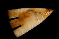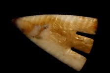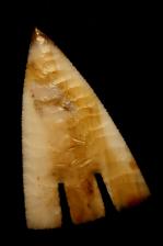 Here is a large Calf creek knapped from Piaute Agate. The point has really sharp edging and nice colors. A unique piece for sure. |