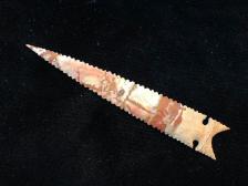 This long serrated south west style point is made out of what I think is a piece of Oregon Owyhee picture jasper. This stuff was tough!, it was like flaking a brick. Nonetheless, it came out with a beautiful pattern. |