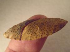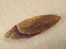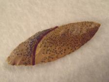 This point was chipped from a small slab of picture jasper, and is a little thick (3/16") for its size, but it is beautiful stone with rich colors and patterns. |