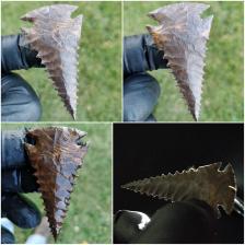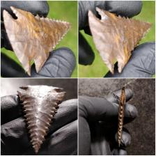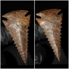Nice Pine Tree Point in a great piece of Rainy Buttes Petrified Wood. Nice color and preservation on this piece, with wood grain visible on the A side. Nice quarts healed fracture through the piece as well, and when held to the light a portion of it can be seen through near the base. Very sharp tip and edges. Smooth clean flaking both faces, with the A side having the most prominent scars and median ridge.