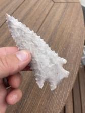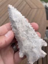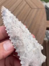 A pinetree point made using a biface of Burlington that had some amazing crystal inclusions. This point also has a nice bevel. 4 1/4 x 1 15/16” |
