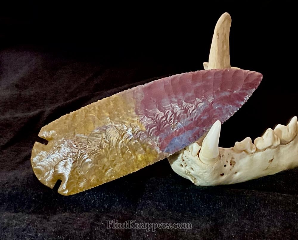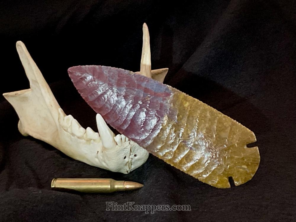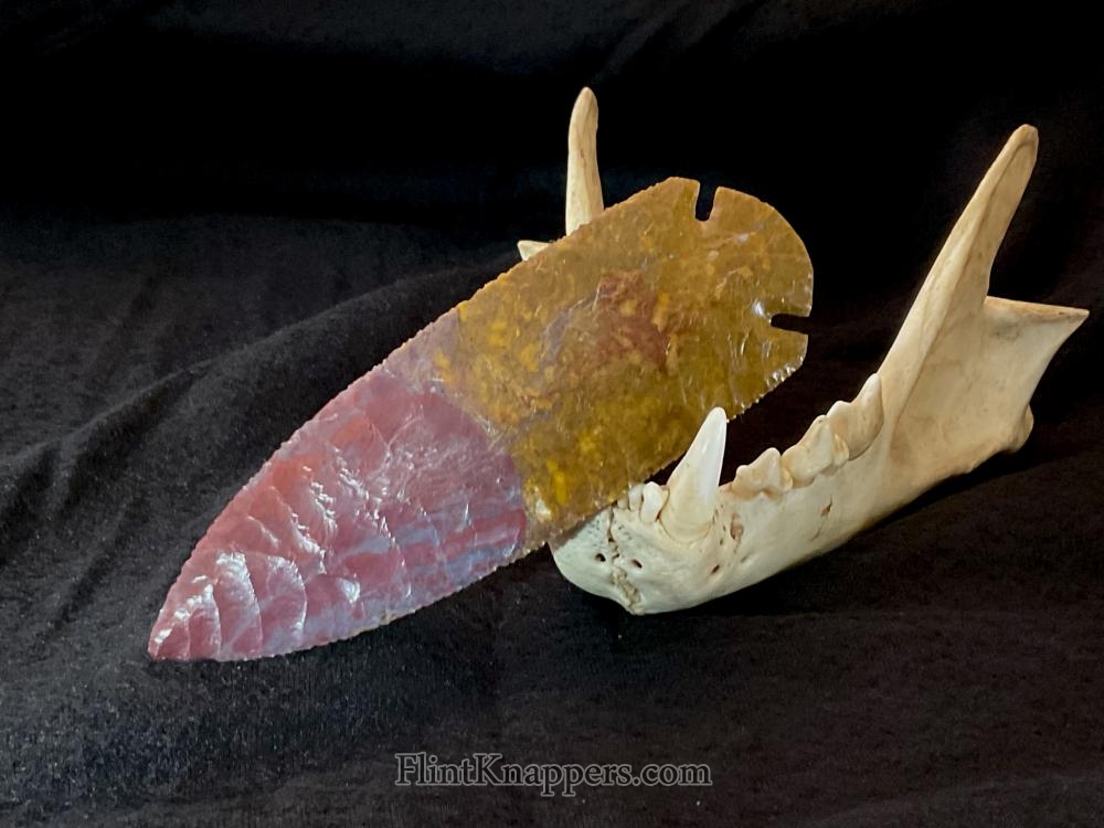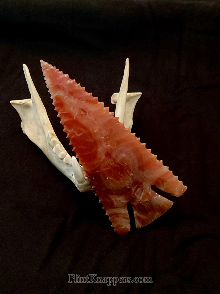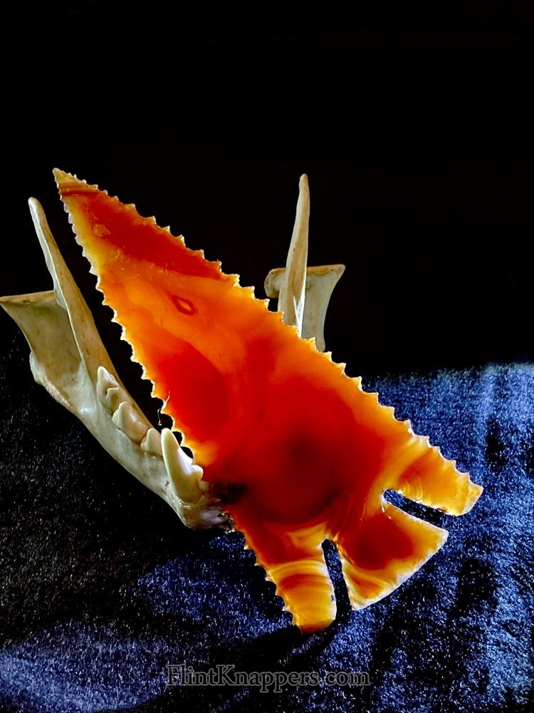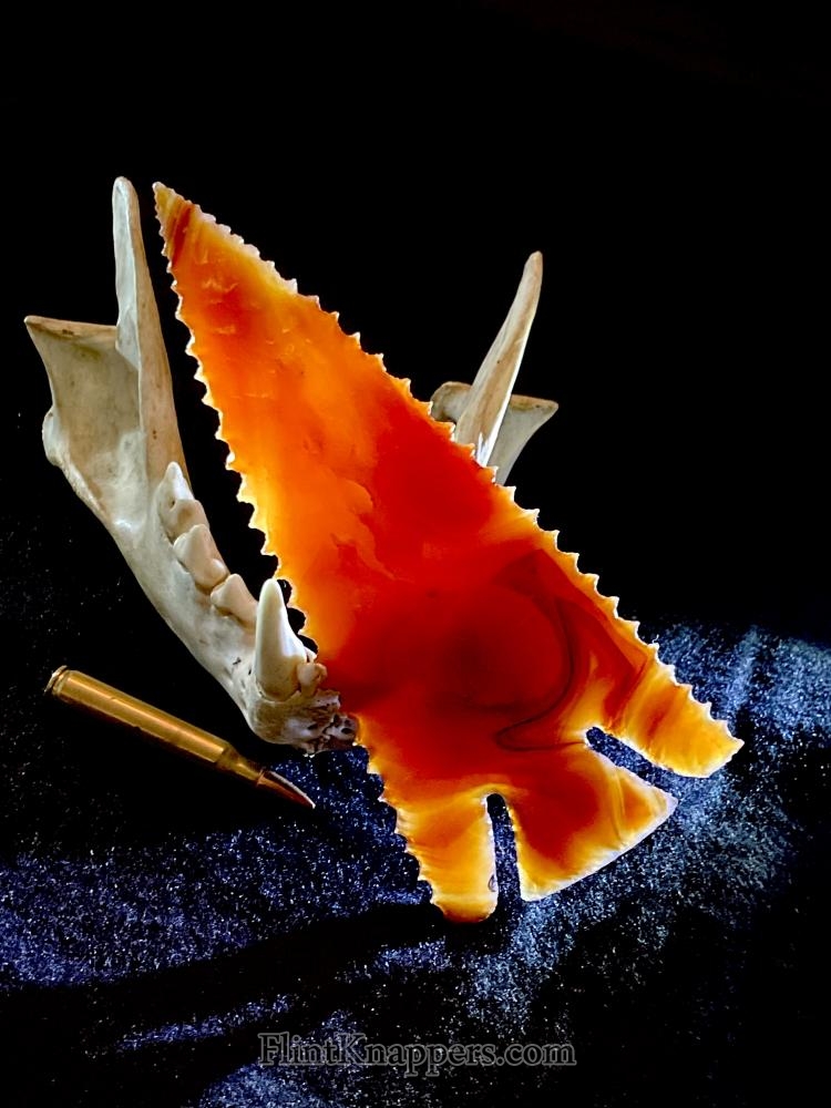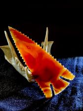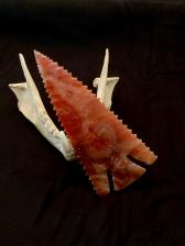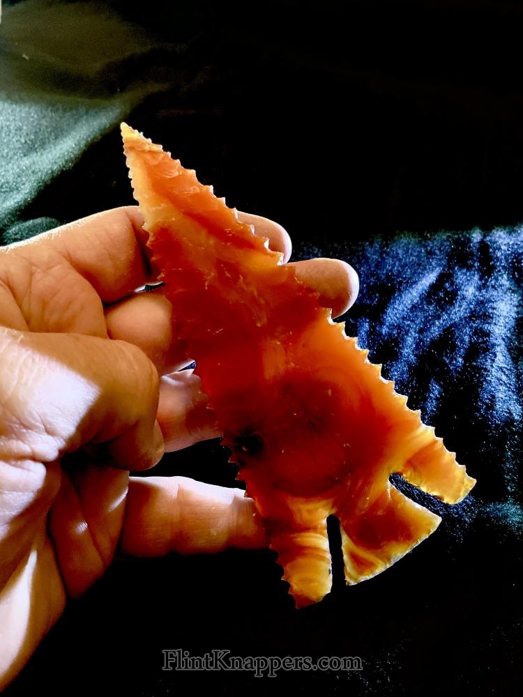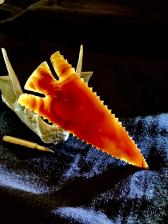 This is a premium piece of Piranha Agate. It was tough to knap but the point came out great. This is a large Serrated Pintree with narrow, one inch deep notches. The whole point is a fiery orange and when it is backlit it looks like a glowing coal just pulled from the fire. It will be a great addition to your collection. |
