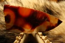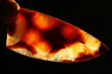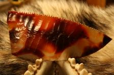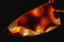Stunning. Absolutly stunning. This is as good as it gets. This is a rare piece of stone and it was a knappers dream. This blade worked about as good as a piece of agate can work. This point has beautiful flaking and the edge work is unmatched with an extra fine serrated blade and a micro serrated back. Piranha is running out, especially this quality. This is a rarity, a collectors dream. |