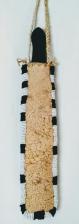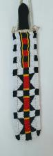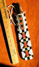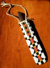 Red,Yellow, Black and White 10/0 seed beads sewn on with small diameter artificial sinew and brain tanned buckskin I tanned. Buckskin rawhide I made for the inner sheathe and sewn with rawhide at the top with a chord twisted buckskin strap for your belt. All hand sewn sturdy serviceable sheathe. Sheathe includes knife unless you don't want it we'll work something out just ask.