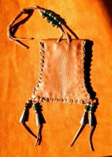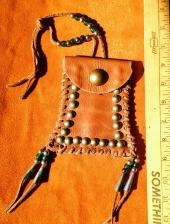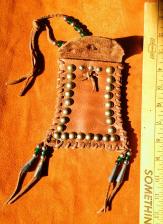 Heavy leather I found at a saddle shop along with the brass tacks. I made the pattern for this piece. Sewn with leather strap I cut from the same material. 3 nickel tacks,24 3/8" brass tacks,1,1" brass tack,16 nickel beads, 10 translucent green glass trade beads and 4 1" tin cones. Brass tacks do not have lacquer on them. Awesome replica just needs a little age to finish it off. |