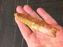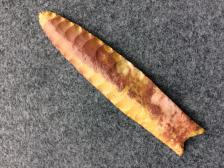 A beautiful Plainview, knapped by master flint knapper, Steve Behrnes. Knapped from a beautiful piece of Oregon Sunset Jasper, with colors of yellow, red and pink. Very nice parallel flaking. Knapped Feb, 2002. Signed with diamond scribe: SB 02 |