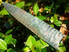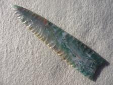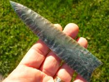 A nice Plainview, knapped by Virgil Tonn, master knapper from Texas. It’s made of green Bloodstone from India. Besides shades of green, there is purple, light blue, and red. Knapped June, 2003. |