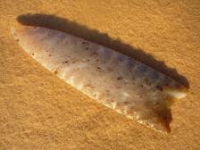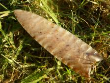 Christmas Special! Nice flaking on this Virgil Tonn Plainview. Virgil is an excellent knapper from Texas and has been knapping many years. This Plainview is out of Sunset Jasper from Oregon, maybe what they call Pigeon Blood. The colors are cream and brownish purple, with specks of ‘Pigeon Blood’. Knapped March, 2000. Signed: V (cursive) |