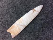 Beautiful parallel flaking on this Virgil Tonn white and tan, with dark brown markings, Plainview. Virgil is an excellent knapper from Texas and been knapping for decades. This Plainview is made from Paiute agate from Oregon. Knapped March, 2002. Signed: VT 2 |