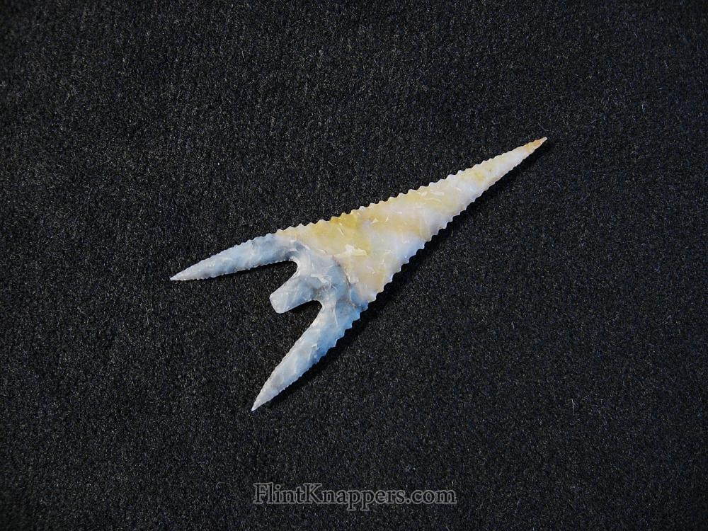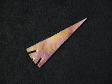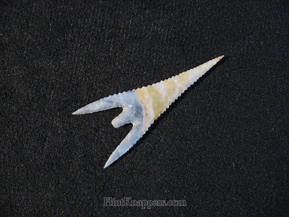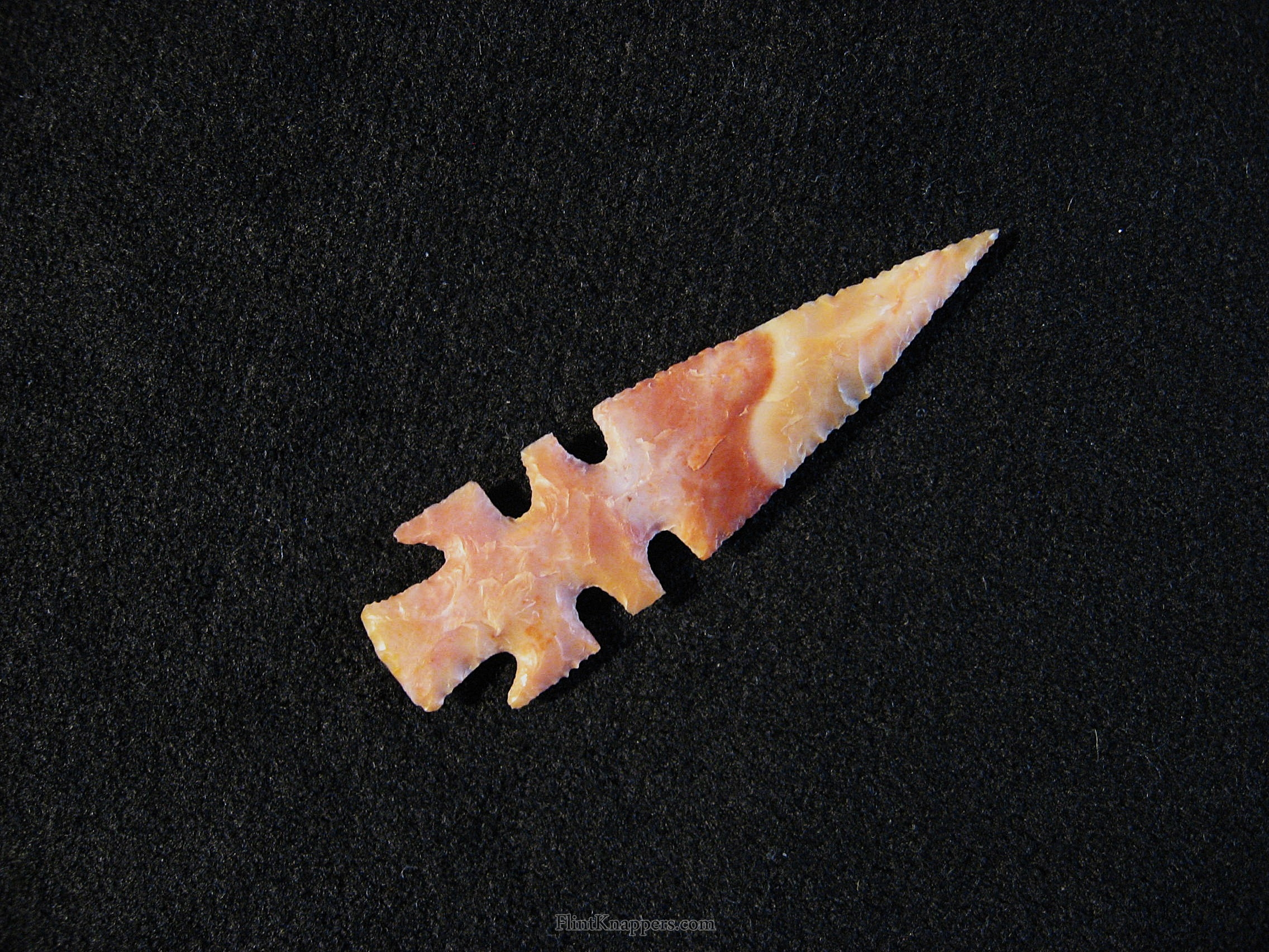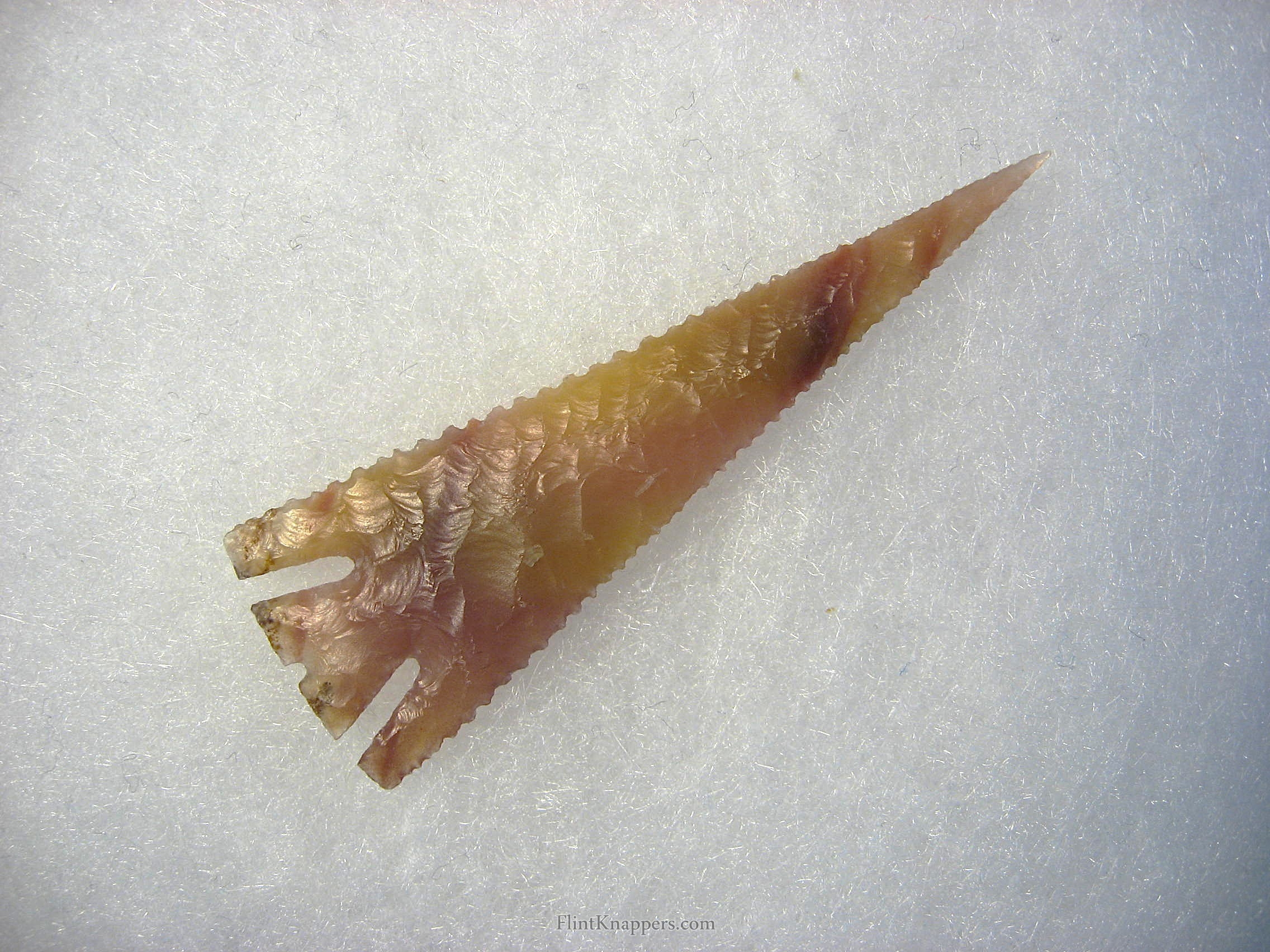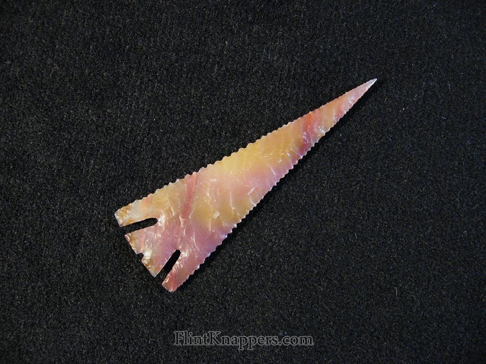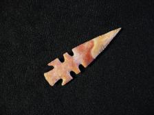 Small side notch arrowpoint made from Oregon plume agate. Translucent material with small orange and yellow colored plumes. Fine little point. |