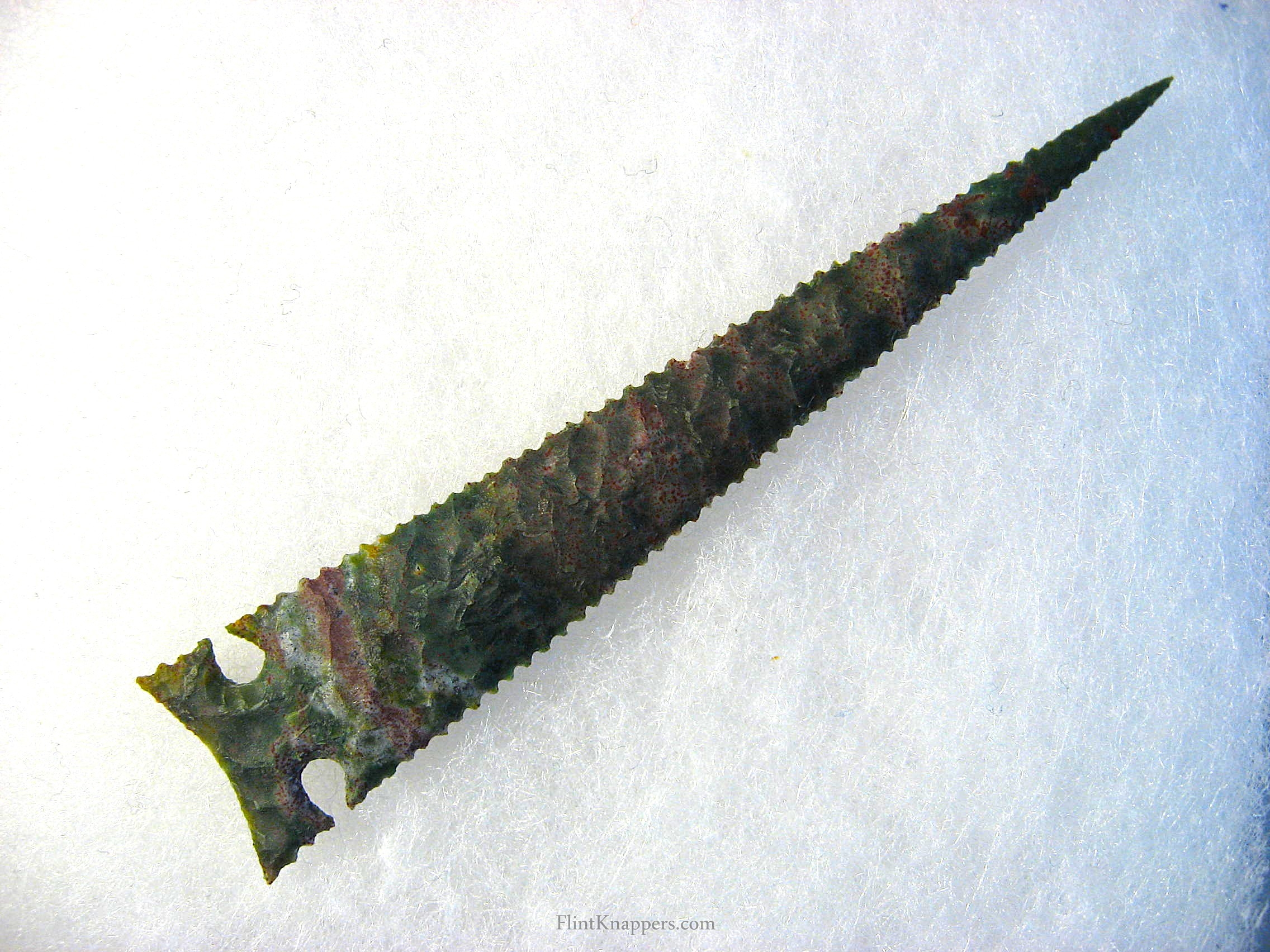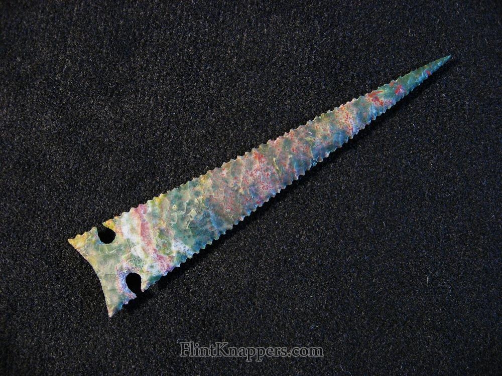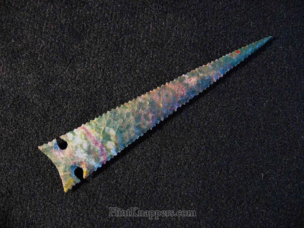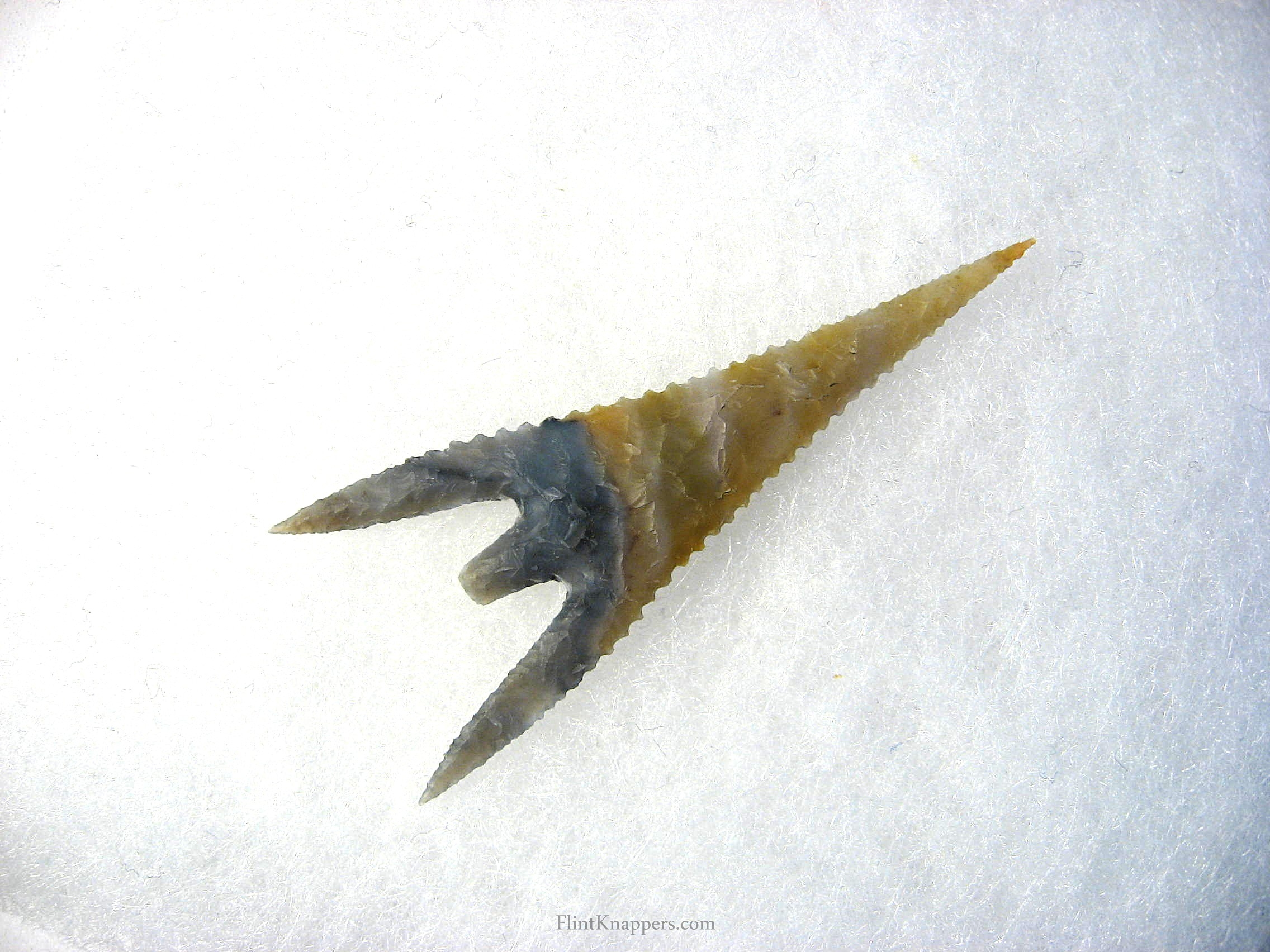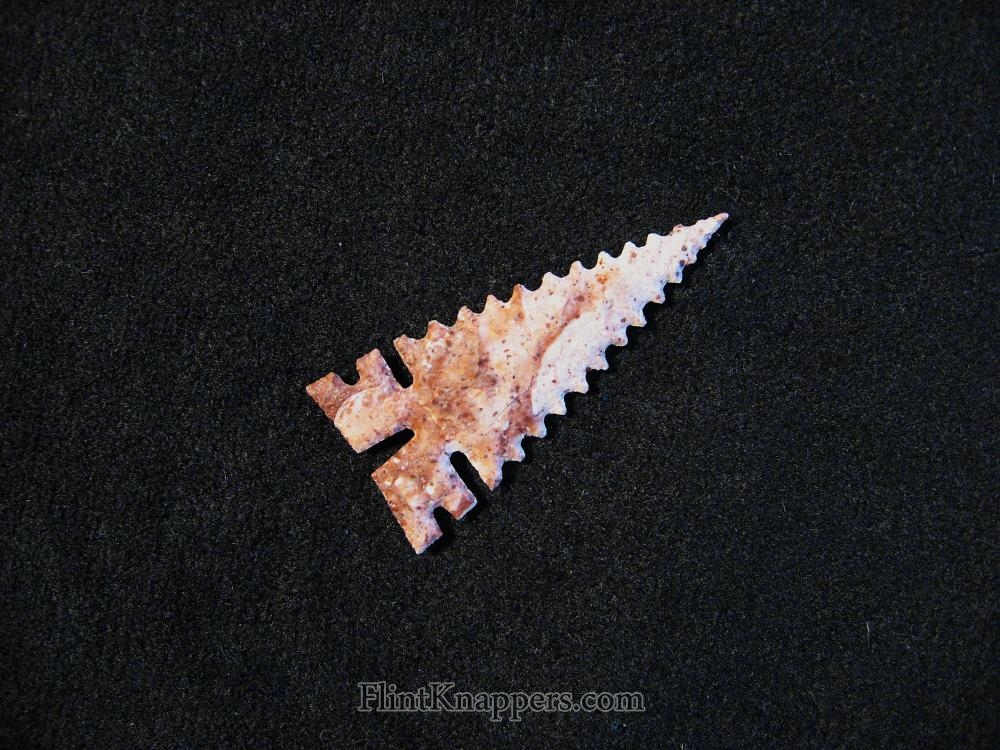 Small side notch arrowpoint made from Oregon plume agate. Translucent material with small orange and yellow colored plumes. Fine little point. |