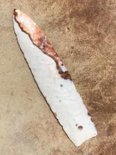 I bought a nice looking slab for $8 at a rock and gem show last year, and had fun pressure flaking this nice blade a few days ago. |