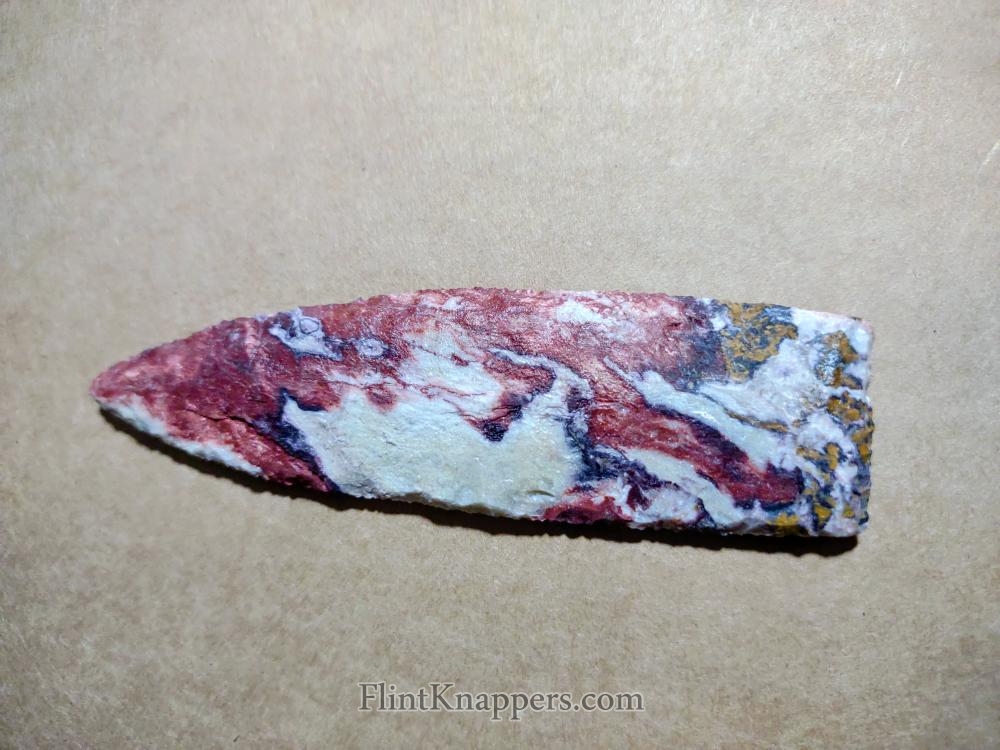 This Elko point is knapped from a stunningly beautiful piece of peach, aqua blue and beige Polychrome Jasper. |