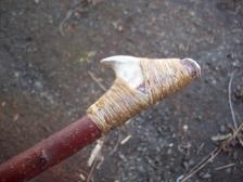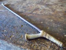 The Estolica was the atlatl style favored by cultures from Baja California to the coasts of Peru and Chile. The simple yet highly versatile 'fineal' handle design allows for multiple grips including hammer, paddle, and split-finger as well as multiple variations thereof. Although many examples, including some found in 'Moche' culture tombs, are quite sophisticated and elaborite with hammered copper spurs and gold gilding, mine is a more 'primitive' version featuring a deer antler fineal and spur secured with rawhide and sinew, respectively, to a steam straightened and stabilized bark-on willow mainshaft. At 28'' it is an ideal long distance thrower and a total steal at just $45. |