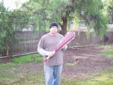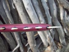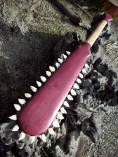 32'' of sheer terror! made of solid and beautiful purpleheart, this club sports an impressive array of wickedly sharp aligator gar scales. these scales are strong as teeth with a natural serration. they are set in the club body using PPG. the handle is wrapped with hand twisted raffia cordage.