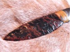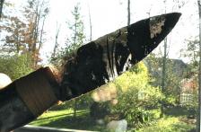 At 11’ long, this a bigger knife. The Pronghorn antelope antler material took much handwork & time in bringing it to a shiny sheen...but wow, how comfortable in the hand! The hand-knapped obsidian blade is a real slicer, & as you can see in the backlit picture, it really has some black flames running thru it. It’s tightly hafted & epoxied together & secured with sinew. Would make a nice piece of kit - for your Mountain man “possibles” bag. A seldom seen design! ($10.00 shipping & ins.). |