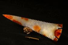 This amazing piece of Piranha is the largest Serrated Pinetre that I have knapped. Months in the making, I am very proud of this piece of art. . The combination of fiery swirls and orange flames high light this awesome Serrated Pinetree. The point has extremely sharp serrations and very deep, narrow notching. The is a destructive piece of graceful art. |