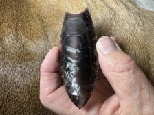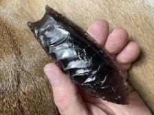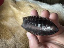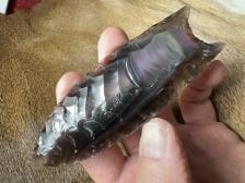 Made from beautiful Rainbow obsidian, shows up nicely when held at an angle to a light source! Nice chevron flaking and serrated sharp! Hafting area is ground, thanks for looking! |