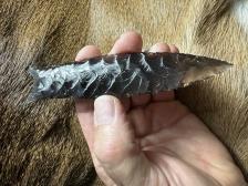 Made from beautiful semi translucent Rainbow obsidian from California! The colors show up best when held at an angle to a bright light source. Nice chevron flaking pattern and serrated sharp! Hafting area is ground. Thanks for looking!