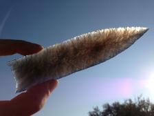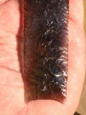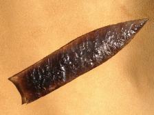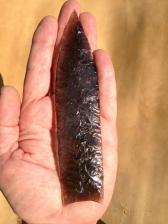 This is a nice obsidian blade made by percussion, further thinned and finished by pressure. There are layers of green, purple and blue that I couldn't quite capture well in a photo. Nice blade for a knife, spear, frame, or mantle. |