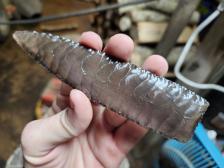 A nice flaked rainbow obsidian blade has a pink color to it.