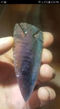 A nicely flaked, deep corner notched point. When under direct light or sunlight it displays beautiful blues and hues of purple. Thanks for viewing.                       |