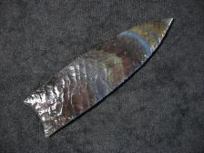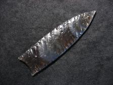 This nice large Humboldt point was started from a large spall of Davis Creek obsidian. Eventually got a really nice flake pattern on this one. Pretty nice color in this one when hit with light from the right angle |
