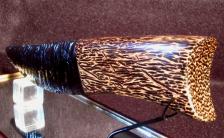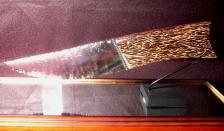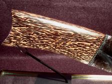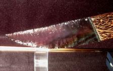 Exquisite  show knife made of brilliant rainbow obsidian from Davis Creek, CA. Hafted into a highly polished perfect piece of black palm wood. Top shelf piece.