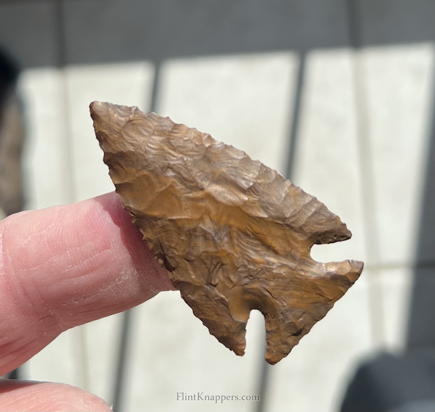 This corner notch point is made from rainy buttes material that has some striping going on that gives it a look different than most rainy buttes points that I have made. Well made with nice notches. |