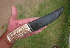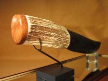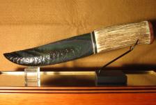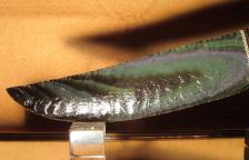 Very hard to get this material. It was mined out almost 25 years ago and old collections are like finding hen's teeth. But here is a superb knife made of it and matched with an elk antler, amboyna burl and ebony handle and finished with sterling silver patterned wire.