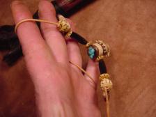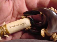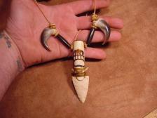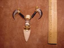 Here is a beautiful corner notched arrow head I knapped from berlington chert and make into a necklace, a hafted a small antler piece and carved a bear track on the front, The two black bear claws are real and I strung it together with some real carved bone bead spaces, adjustible brown leather cord. Signed bonecarver and numbered. |