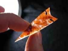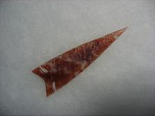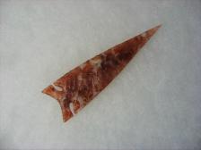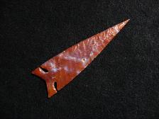Classic styled Northern California Wintu point knapped from a real pretty piece of bright red agate. This piece had some small crystal spots including a small hole that opened up. Challenging, but turned out sweet! Kind of mossy looking when held up to light. Super fine made point! |