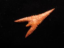 I was sort of just goofing around winding down after a long day when I made this point. It was made from a lop sided flake of red sunset jasper so I made it a bit more asymmetrical like so many of the originals were with one barb longer than the other. I ran the notches deep and left the stem more of a pointed 'nub' which was common on the old points as they were pitched into the arrow nocks and sinewed anyway I made the serrations rather large and coarse and when it was done it looked an awful lot like the old ones do. Some Kalapuya points in the Southern Willamette Valley looked like this although not as common as they are in Southern Oregon. Good thing its diamond signed as I do on all my work! |
