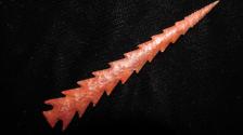 This Hohokam point is made from a nice red jasper. They're a pain to make.its always like defusing a bomb but it turned out nice. I don't make a lot of these. |
