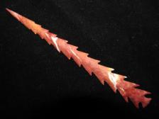 This longer-than-usual SW Hohokam point is made from a piece of red Mook jasper. I don't make a lot of these, its literally back breaking at times. Bid quick, it'll go fast. |