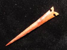 This skinny little point is a Southwestern Gatlin type. Its made of red Mookite jasper. Chipping this tip and putting in the fine serrations was like defusing a bomb. Skinny and delicate. |