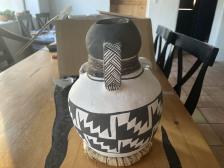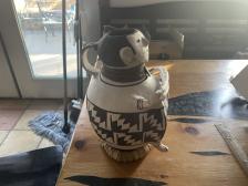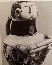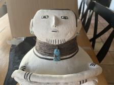 Made from hand dug clay and mineral paint. Pit fired, replica of this old one in the last pic. Yucca cordage dyed black with oak falls. Turquoise earrings and necklaces. I named him the Arrow Maker. He has two arrows on his lap |