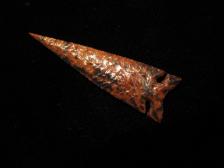 This pretty little point is made out of a mahogany red obsidian with gold sheen flash in it. I made this one more in the size range of original points I've seen. Most original Wintu points are rather thin and delicate as this one is. |