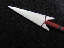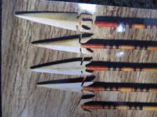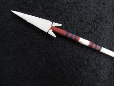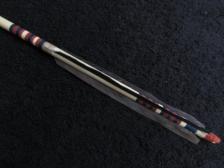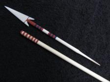 This replica Hupa arrow is a close copy of an original in a private collection. The main shaft is made from a shoot of syringa . The removable fore shaft is made from a shoot of wild cherry. The large side notched elk bone point is a type seen from Hupa country and has a stem along with side notches and is glued into the notch and sinew wrapped. Be sure and look at the photo of the originals at the bottom of the pic list. Red and dark blue-green pigments were used on this arrow just like the originat. The fletch is Canada goose wing feathers lashed with sinew and glued with hide glue. Fine rings are cut into the shaft with horse tail rush, a trait very commonly seen on CA arrows from the Lower Klamath River. This large elk bone point takes longer to make than a typical late period side notched point but it is how they were made. |