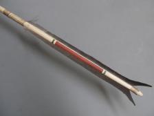 This replica Cheyenne arrow is a close copy of one in a set that is in a private collection. This one is made from a shoot of wild rose which the Cheyenne were noted for using for arrow shafts. It is grooved with three shaft grooves one wavy and the other straight which when fire hardened helps prevent warping. The point is made out of an old barrel hoop and lashed with sinew. It has a slight chisel tip on it, a trait which a lot of plains iron arrow tips have rather than coming to a sharp point. Red ochre and green trade paints are used for the crest and peacock wing feathers are used for the fletchings which resemble the dark raptor feathers on the original arrow. The feathers are glued to the shaft with hide glue. Been working on my own archery equipment for hunting season so I've been lax in making too many for other sales but here's one. |