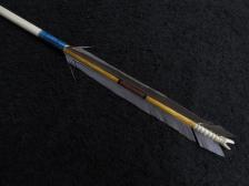 This replica Comanche arrow is copied after one in a private collection. The shaft is made of a wild hard wood shoot and has a flared bow string nock that helped facilitate the pinch grip arrow release used by the Comnache. The shaft is also grooved with three wavy lines which when fire hardened help keep the shaft from warping. The iron trade point is made out of an old barrel hoop like the old ones were entirely by hand and lashed in with sinew. The cresting is red and yellow ochre, and ground soot used for black.. The blue stained -painted sinew is laundry bluing which many of the Southern Plains tribes often adorned their arrows with. The fletchings are hen peacock wing feathers wrapped with sinew and glued down with hide glue. Many Comanche arrows have an open spiral of sinew wrap that goes through the feather webbing near the string nock which is a bit different than many plains arrows. |