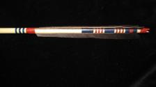 Here's a nice replica Hupa arrow typical of the tribes that lived on the lower Klamath and Trinity Rivers in NW California . It is a compound or two part arrow with the fore shaft made of service berry with an yellow jasper side notched point set in the notch with pitch and sinew. The main shaft is made of syringa and has Canada goose feathers for fletchings all wrapped with sinew and glued with hide glue. Blue and red trade pigments are used on this arrow for painting the crest colors and the sinew lashings just like on the originals. The fletch length, paint crests and colors are very copies and sizes from the old original arrow. I'll provide more details to the buyer. I actually have hunted with arrows like this and they work just fine. |