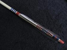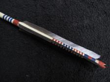 This replica Hupa arrow is a close copy of a number of originals I've been able to examine over the years. The shaft is made from a shoot of syringa and grooved and heat treated to help keep the shaft from warping which is why it was done on plains arrows as well. The yellowish jasper point is the typical late side notch style from this region and is set into its notch with pitch and sinew painted red. Red and blue pigments were used on this arrow as many of the old once had commercial paints obtained from the local mercantile or trading post. The fletch is Canada goose wing feathers lashed with sinew and glued with hide glue. The sinew wrappings are all painted which was commonly done on these arrows. Fine rings are cut into the shaft with horse tail rush, a trait very commonly seen on CA arrows from the Lower Klamath River. The Yurok, Karok, and Hupa all made archery gear that is very similar. These arrows were shot from short wide powerful sinew backed yew wood bows. |