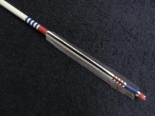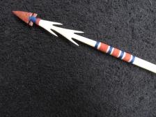 This replica Hupa arrow is a close copy of an original from the late Dr. Charles (Bert) Grayson collection. The main shaft is made from a shoot of syringa. The wicked looking multi barbed foreshaft is made from a piece of elk leg bone and is tipped with a small red jasper stone point and lashed with sinew like the original. The red and dark blue pigments used on this arrow are close copies of the original colors. The fletch is Canada goose wing feathers lashed with sinew and glued with hide glue. Fine rings are cut into the shaft with horse tail rush in the paint crest area and sinew lashing spots which is, a trait very commonly seen on CA arrows from the Lower Klamath River. This is a hard arrow to make well and the bone fore shaft takes a long long time to make. But its how the originals were actually done |