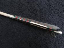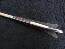 This arrow is a close copy of one Ishi made after he came out of the wilds in 1911and lived in San Francisco. It is carefully copied after Hearst Museum Specimen # 1-19865. When in 'civilization' Ishi liked using birch dowels and turkey feathers along with bright commercial paints similar to his old crest designs he used while still living in his homeland. The shaft is commercial dowel, the point is obsidian and is very closely copied after the original one on the arrow. It is held with hide glue and sinew lashings as are the wild turkey wing feathers. Ishi made and shot arrows like this one with Saxton Pope after they became acquainted. I will ship this in a sturdy shipping container |