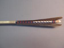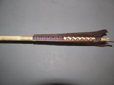 This is a very accurate replica of Hearst Museum Ishi Arrow specimen # 1-19578 and is one of Ishi's hunting arrows taken from Grizzly Bear's Hiding Place camp on Deer Creek in 1908. It is tipped with a glass window pane point like Ishi's originals. The main shaft is syringa and the 8" fore shaft is made of service berry and glued into its nock with pitch. Dark blue pigment and red earth ochre are used to copy Ishi's arrow crest. Feathers and point are lashed with deer sinew. The original feathering is vulture so peacock feathers were substituted for legal purposes.. This arrow is signed. I don't make too many of these. |