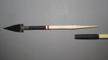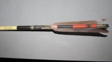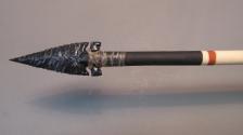 Ever wonder how a Wintu point looks on a Wintu arrow? Here you go! This arrow is coped very closely after an original old Wintu arrow. It is a compound or two part arrow with the fore shaft made of service berry with an obsidian Wintu point set in the notch with pitch and sinew. The main shaft is made of ssyringa and has Canada goose secondary feathers for fletchings all wrapped with sinew. Soot and orangish earth ochres are used for paint crests on this arrow. The fletch length, paint crests and colors are exact copies and sizes from the old original. The Wintu lived in the Northern Sacramento Valley of CA and were neighbors of the Yana and Yahi, Ishi's people. |