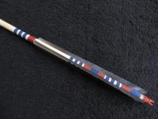 This arrow is based on an original housed in the Hearst Museum at U.C. Berkeley Hearst Museum that was collected circa 1901 I believe in the Yurok village of Weitchpec at the junction of the Klamath and Trinity rivers. The main shaft is syringa and the foreshaft is made of service berry. The Gunther Barbed point is made out of a grayish green piece of un heat treated Franciscan chert I picked up in the gravels of the Mad River in NW California. It is glued in place with pitch and lashed the way the old ones were with sinew painted red. Red and blue pigment copy the crest of the old original arrow which also had green Franciscan chert points hafted in a similar fashion. Goose feather fletchings are lashed with sinew which has been painted and glued down with hide glue. This is a time consuming arrow to make. |